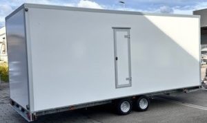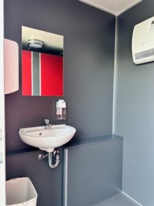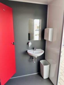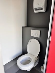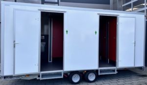 Unser „Maxi Medium“ Toilettenwagen ist ausgestattet mit 3 Damentoiletten, einer Herrentoiletten und 3 Pissoirs. Bei den Damen wie auch bei den Herren gibt es ein Handwaschbecken mit Handtuch- und Seifenspender sowie jeweils einen Mülleimer und Spiegel.