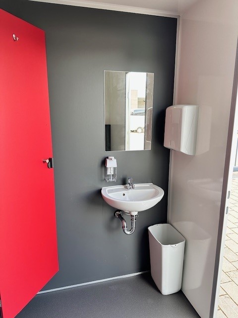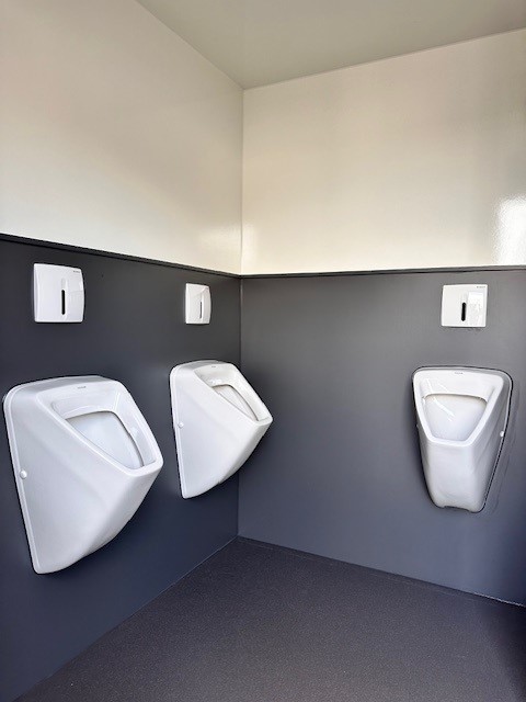 Unser „Maxi Medium“ Toilettenwagen ist ausgestattet mit 3 Damentoiletten, einer Herrentoiletten und 3 Pissoirs. Bei den Damen wie auch bei den Herren gibt es ein Handwaschbecken mit Handtuch- und Seifenspender sowie jeweils einen Mülleimer und Spiegel.